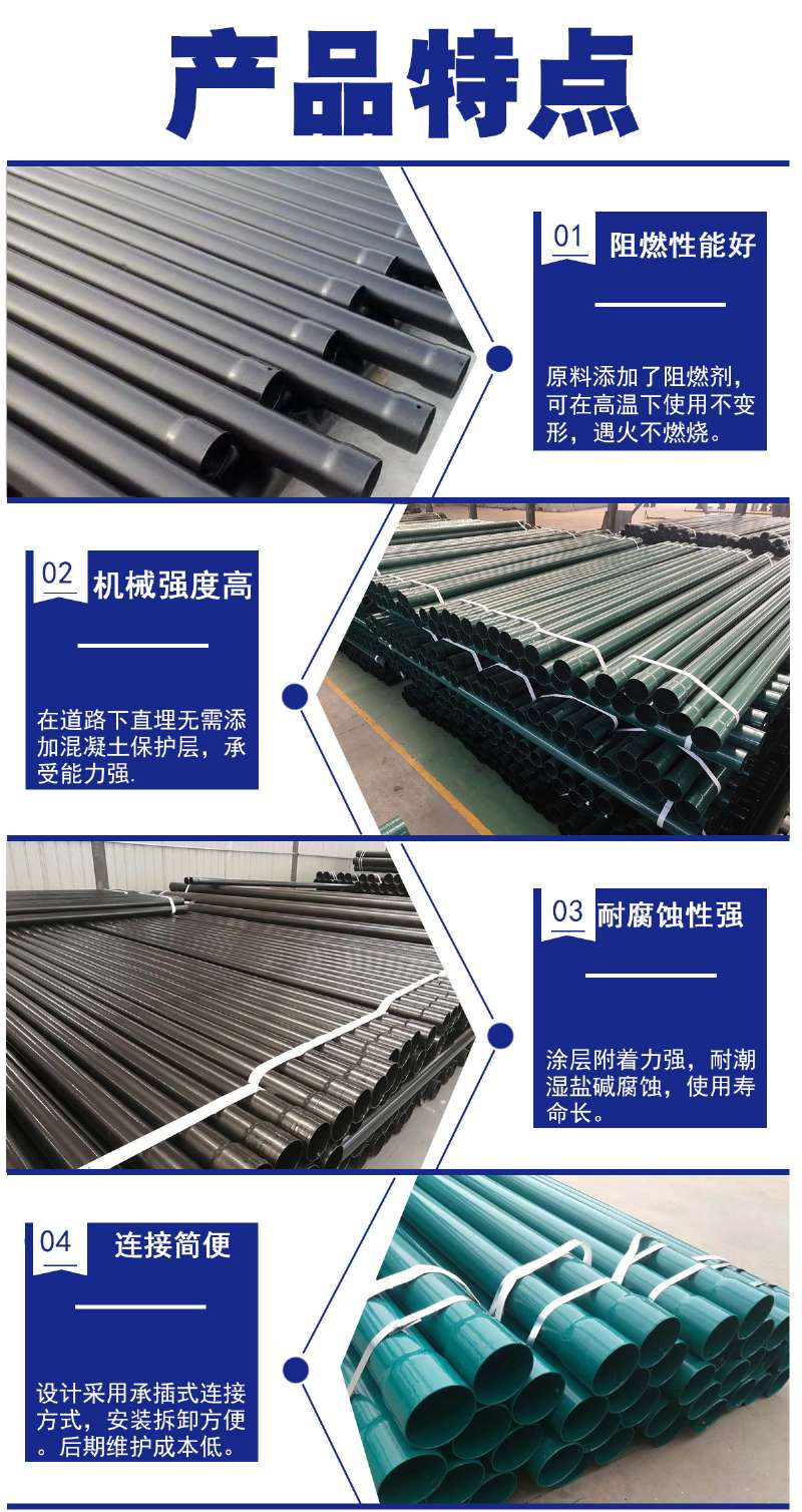 熱浸塑穿線管隨著電力電纜埋地敷設(shè)工程的迅速發(fā)展,對電纜套管提出的更高要求,熱浸塑穿線管是以高強度的鋼管為基礎(chǔ)材料,不飽的聚酯樹脂為基體材料,采用熱浸塑而成。